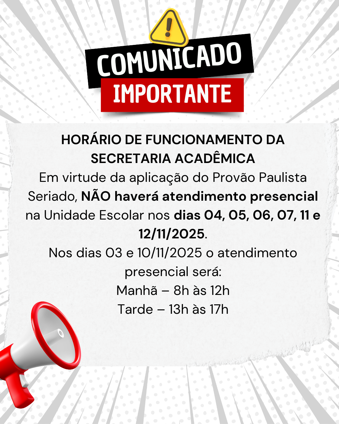 Em virtude da aplicação do Provão Paulista Seriado, NÃO haverá atendimento presencial na Unidade Escolar nos dias 04, 05, 06, 07, 11 e 12/11/2025.